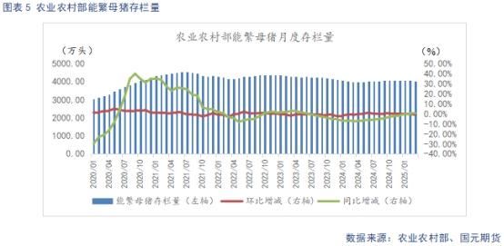根據(jù)農(nóng)業(yè)農(nóng)村部數(shù)據(jù)顯示,2025年3月末全國能繁母豬存欄量4039萬頭,同比上升1.2%,環(huán)比下降1%,根據(jù)農(nóng)業(yè)農(nóng)村部新修正的《生豬產(chǎn)能調(diào)控實施方案》,當(dāng)前能繁存欄相當(dāng)于正常保有量的104.6%,處于綠色偏高區(qū)域。24年12月至25年3月期間,能繁母豬存欄有所去化,不過24年4月至24年11月,能繁母豬存欄逐月環(huán)比回升,以生產(chǎn)周期推算,25年前三季度處于產(chǎn)能兌現(xiàn)期。