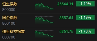 5月22日消息,港股三大指數(shù)低開(kāi)低走,截至收盤(pán),恒生指數(shù)(23544.311, -283.47, -1.19%)跌1.19%,報(bào)23544.31點(diǎn),恒生科技指數(shù)(5251.75, -90.66, -1.70%)跌1.70%,國(guó)企指數(shù)跌1.19%。盤(pán)面上,科網(wǎng)股普遍下挫,聯(lián)想集團(tuán)(9.57, -0.55, -5.43%)跌超5%,百度集團(tuán)跌超4%,嗶哩嗶哩、阿里巴巴跌超3%,快手、小米集團(tuán)、網(wǎng)易跌超2%;黃金股分化,大唐黃金(0.215, 0.02, 10.26%)漲超10%;部分藥品股沖高,艾美疫苗(4.15, 0.54, 14.96%)漲近15%。