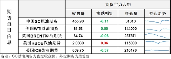 【1】WTI主力原油期貨收跌0美元,跌幅0%,報(bào)61.53美元/桶;布倫特主力原油期貨收跌0.04美元,跌幅0.06%,報(bào)64.74美元/桶;INE原油期貨收跌0.11%,報(bào)455.9元。