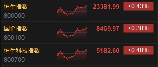 5月27日消息,港股三大指數(shù)震蕩走高,截至收盤,恒生指數(shù)(23381.99, 99.66, 0.43%)漲0.43%,報(bào)23381.99點(diǎn),恒生科技指數(shù)(5182.6, 24.95, 0.48%)漲0.48%,國企指數(shù)漲0.38%。盤面上,科網(wǎng)股普漲,美團(tuán)漲超2%,網(wǎng)易漲超1%,京東集團(tuán)跌1%;CXO概念股齊漲,維亞生物(1.86, 0.21, 12.73%)漲超12%;啤酒股集體上漲,青島啤酒股份(55.2, 2.10, 3.96%)漲近4%;茶飲股走強(qiáng),蜜雪集團(tuán)漲近10%。