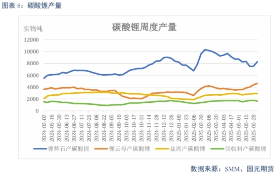 截至6月5日當周,鋰輝石生產(chǎn)碳酸鋰產(chǎn)量8324噸,較上周增760噸;鋰云母生產(chǎn)碳酸鋰產(chǎn)量4632噸,較上周增250噸;鹽湖產(chǎn)碳酸鋰產(chǎn)量2917噸,較上周增10噸;回收產(chǎn)碳酸鋰產(chǎn)量1643噸,較上周減129噸。