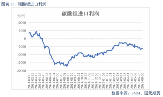 截至6月6日,碳酸鋰進口利潤為-6159.7元/噸,較上周增314.7元/噸。