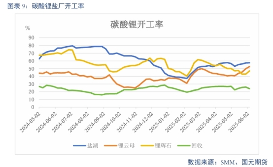 截至6月5日,鋰輝石提鋰開工率為47.01 %,較上周增4.08個百分點;鋰云母提鋰開工率為52.68 %,較上周增2.84個百分點;鹽湖提鋰開工率為57.6 %,較上周增0.19個百分點;回收提鋰開工率為23.93 %,較上周減2.18個百分點。