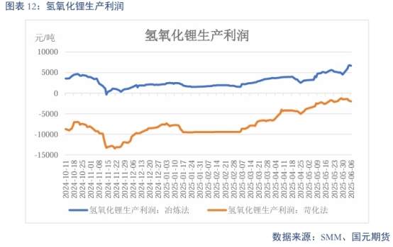 截至6月6日,冶煉和苛化產(chǎn)氫氧化鋰利潤為6624元/噸和-2032元/噸,較上周增1813元/噸和-780元/噸。