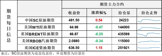 【1】WTI主力原油期貨收跌0.31美元,跌幅0.47%,報(bào)64.98美元/桶;布倫特主力原油期貨收跌0.17美元,跌幅0.25%,報(bào)66.87美元/桶;INE原油期貨收漲0.54%,報(bào)481.5元。