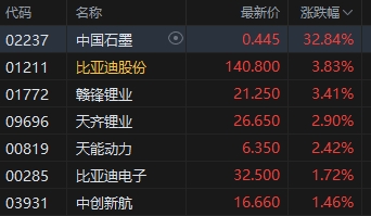 6月11日消息,港股三大指數(shù)震蕩走高。截至收盤,恒生指數(shù)(24366.941, 204.07, 0.84%)漲0.84%,報(bào)24366.94點(diǎn),恒生科技指數(shù)(5451.2, 59.01, 1.09%)漲1.09%,國企指數(shù)漲1.07%。盤面上,科網(wǎng)股普漲,嗶哩嗶哩漲近10%,網(wǎng)易漲超2%,阿里巴巴、京東集團(tuán)、聯(lián)想集團(tuán)(9.35, 0.15, 1.63%)、小米集團(tuán)、快手漲超1%;中資券商股全線上揚(yáng),廣發(fā)證券(12.74, 0.74, 6.17%)漲超6%;稀土概念大漲,中國稀土(0.91, 0.14, 18.18%)漲超18%;汽車、鋰電池股走強(qiáng),中國石墨(0.445, 0.11, 32.84%)大漲超32%,比亞迪漲近4%;泡泡瑪特(269.8, 11.00, 4.25%)漲超4%。