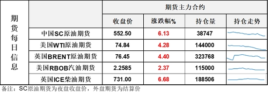 【1】WTI主力原油期貨收漲3.07美元,漲幅4.28%,報(bào)74.84美元/桶;布倫特主力原油期貨收漲3.22美元,漲幅4.4%,報(bào)76.45美元/桶;INE原油期貨收漲6.13%,報(bào)552.5元。