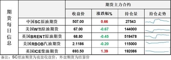 【1】WTI主力原油(607, -8.60, -1.40%)期貨收跌0.45美元,跌幅0.67%,報(bào)67美元/桶;布倫特主力原油期貨收跌0.31美元,跌幅0.45%,報(bào)68.8美元/桶;INE原油期貨收漲0.66%,報(bào)507元。