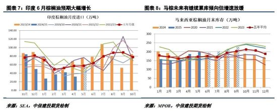 馬棕4-5月的連續(xù)大幅累庫一度令棕櫚油走勢承壓,然而,隨著馬棕產(chǎn)量增長放緩而出口保持高位,馬棕未來幾個(gè)月的累庫速度有望放緩。MPOA預(yù)計(jì)馬棕6月產(chǎn)量較上月同期降4.59%至169萬噸,船運(yùn)機(jī)構(gòu)預(yù)計(jì)的馬棕同期出口增4.3%-11.7%,暗示馬棕6月可能去庫。路透調(diào)查平均預(yù)計(jì)馬棕6月產(chǎn)量環(huán)比降4.04%至170萬噸,出口環(huán)比增4.16%至145萬噸,月末庫存環(huán)比小降0.24%至198.5萬噸,這或助力增產(chǎn)題材對棕櫚油價(jià)格的利空出盡。