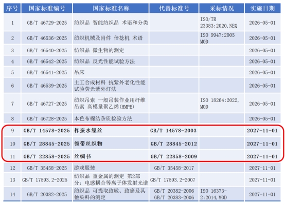 絲綢領(lǐng)域的標準有GB/T 14578-2025 《柞蠶水繅絲》 、GB/T 22858-2025 《絲綢書》和GB/T 28845-2025 《領(lǐng)帶絲織物》等三項國標,實施日期均為2027年11月1日。