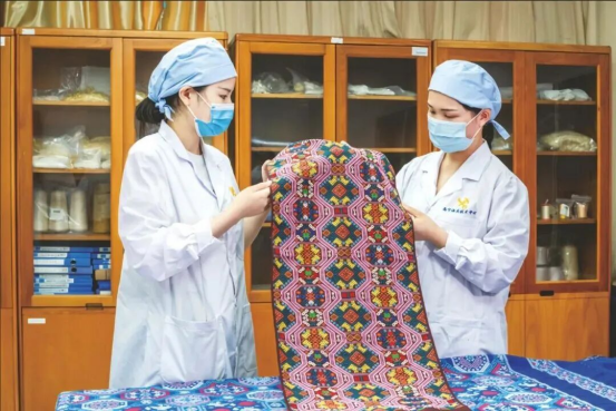 南寧海關(guān)技術(shù)中心工作人員在對壯錦樣品進(jìn)行檢查