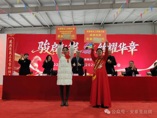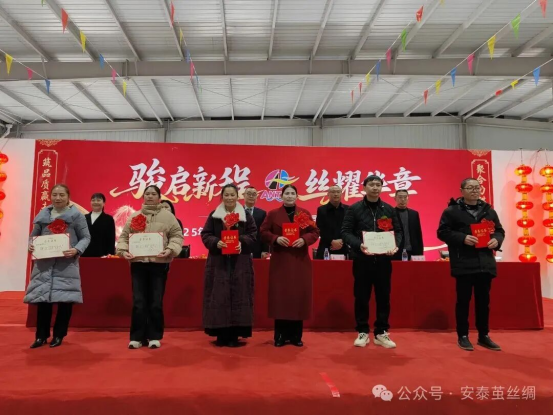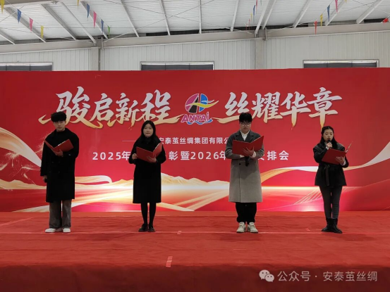 會議在莊嚴(yán)的《世紀(jì)安泰》之歌中拉開序幕。首先,由繭絲綢集團(tuán)財務(wù)總監(jiān)汪菊宣讀《四川安泰繭絲綢集團(tuán)有限公司關(guān)于表彰2025年度先進(jìn)集體和先進(jìn)個人的通知》、《繭絲綢關(guān)于對李遠(yuǎn)玲、唐建超同志的表揚通報》、《繭絲綢關(guān)于表彰2025年度基地蠶桑生產(chǎn)五星級業(yè)主的通知》,對先進(jìn)集體、先進(jìn)個人、優(yōu)秀管理干部、五星級業(yè)主進(jìn)行了表彰。絲業(yè)先進(jìn)員工代表李遠(yuǎn)玲、蠶業(yè)先進(jìn)員工代表孫梅、五星級業(yè)主代表劉均作了發(fā)言,先進(jìn)代表表達(dá)了對公司的感恩,對崗位的熱愛,以及對蠶桑絲綢事業(yè)的傾情付出;表示在以后的工作中將以更高的標(biāo)準(zhǔn)嚴(yán)格要求自己,認(rèn)真履行崗位職責(zé),始終保持工作激情,繼續(xù)為安泰公司的發(fā)展奉獻(xiàn)力量。