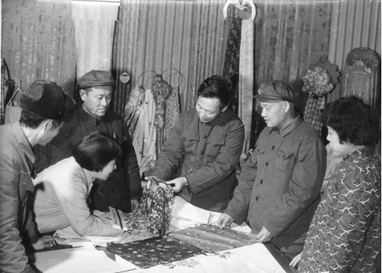 淄博絲織一廠設計人員與廠領導在研究花色