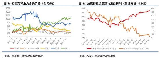 近期加拿大國(guó)內(nèi)對(duì)油菜籽出口抱有樂(lè)觀態(tài)度,ICE菜籽快速走強(qiáng),整體來(lái)到690-700加元/噸關(guān)口,在14.9%的關(guān)稅預(yù)期下,目前進(jìn)口加菜籽榨利已經(jīng)近乎消失。后期需要關(guān)注2026年3月9日之前“反傾銷”終裁的最終發(fā)布結(jié)果。