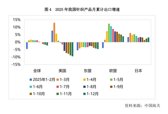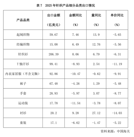 出口品類量增價跌,出口結(jié)構(gòu)向價值鏈上游攀升。2025年,起絨織物、經(jīng)編織物、針織襯衫出口表現(xiàn)良好,出口增速分別為7.46%、6.49%、9.28%,其中,針織襯衫出口額占襯衫出口額的33.25%,同比提升4.42個百分點。T恤汗衫、內(nèi)衣家居服、運動裝受去年同期高基數(shù)影響,出口分別下降8.93%、10.47%、11.54%。針織織物出口保持連續(xù)增長態(tài)勢,在針織產(chǎn)品出口中的占比持續(xù)提高,科技進步推動出口結(jié)構(gòu)向價值鏈上游攀升。另一方面,主要品類普遍出現(xiàn)量增價跌,反映出在勞動力成本優(yōu)勢減弱背景下,低附加值產(chǎn)品面臨的國際競爭尤為激烈,企業(yè)需要通過科技創(chuàng)新,加大高端化、功能化、綠色化等高附加值、差異化產(chǎn)品的開發(fā),從依靠低成本規(guī)模優(yōu)勢的OEM模式,向依托技術(shù)、設(shè)計和快速反應(yīng)能力的ODM模式和品牌化轉(zhuǎn)型。