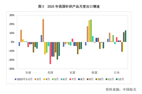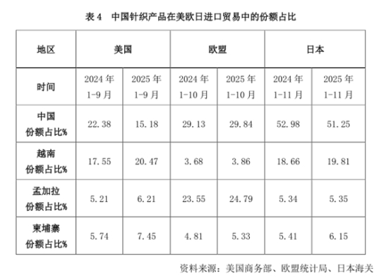 出口市場格局深度調(diào)整。2025年,受關(guān)稅政策影響,對美國出口195.39億美元,同比下降9.41%,我國產(chǎn)品在美市場份額面臨結(jié)構(gòu)性擠壓,據(jù)美國商務(wù)部數(shù)據(jù),2025年1~9月,我國針織產(chǎn)品在美進口市場份額從2024年的22.13%急劇下滑至15.18%,越南市場份額則提升至20.47%,首次超越中國,訂單向越南、柬埔寨等東南亞國家轉(zhuǎn)移趨勢明顯。對歐盟出口159.92億美元,逆勢增長3.95%,據(jù)歐盟統(tǒng)計局數(shù)據(jù),2025年1~10月,我國針織產(chǎn)品在歐盟進口貿(mào)易中占比由2024年的29.32回升至29.87%,領(lǐng)先第二名孟加拉5.08個百分點,顯示出行業(yè)的出口韌性。對日本出口67.18億美元,實現(xiàn)3.14%的增長。據(jù)日本海關(guān)數(shù)據(jù),2025年1~11月,我國針織產(chǎn)品在日本進口貿(mào)易中占比由2024年52.81%小幅回落至51.25%,仍呈下降趨勢。對東盟10國出口178.62億美元,同比下降4.56%,而針織織物出口則同比增長6.33%,反映出美國關(guān)稅政策對成品轉(zhuǎn)口貿(mào)易的影響和我國針織織物在東盟市場的競爭優(yōu)勢。