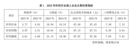 利潤率連續(xù)下降。2025年,針織行業(yè)營業(yè)利潤率3.77%,較2024年同期的4.61%下降0.84個百分點。其中,針織織物營業(yè)利潤率4.07%,較2024年的4.51%下降0.44個百分點;針織服裝營業(yè)利潤率3.61%,較2024年的4.66%下降1.05個百分點。