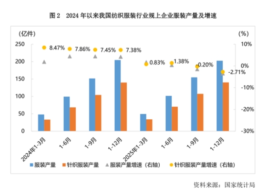 針織服裝份額持續(xù)鞏固。2025年,我國紡織服裝行業(yè)規(guī)模以上企業(yè)服裝產(chǎn)量202.55億件,同比下降3.44%;其中針織服裝產(chǎn)量140.25億件,同比下降2.71%,降幅低于服裝總產(chǎn)量整體水平,顯示出針織服裝的市場需求相對穩(wěn)健。2025年針織服裝產(chǎn)量占服裝總產(chǎn)量的比重達69.24%,較2024年的68.35%略有提升,產(chǎn)業(yè)結(jié)構(gòu)優(yōu)勢持續(xù)鞏固。