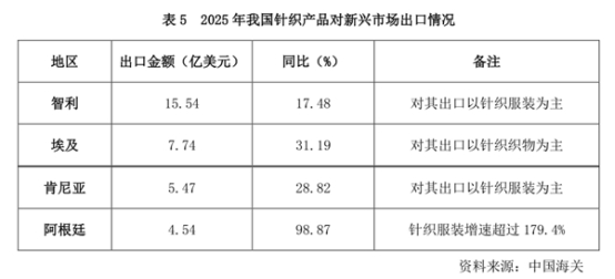 2025年,我國對智利出口15.54億美元,同比增長17.48%,出口以針織服裝為主;對埃及出口7.74億美元,同比增長31.19%,以針織織物為主;對肯尼亞出口5.47億美元,同比增長28.82%,針織服裝占比居前;阿根廷出口4.54億美元,同比激增98.87%,其中針織服裝增速超過179.4%,展現(xiàn)出新興市場的巨大潛力。盡管當前基數(shù)較小,但已成為驅(qū)動出口增長、分散市場風險的重要新興力量。