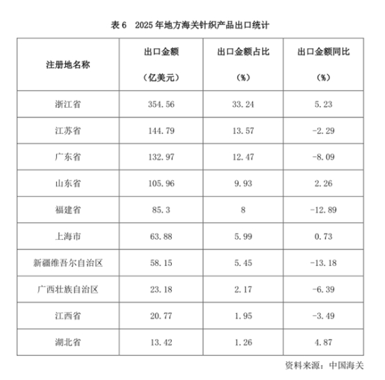 區(qū)域出口分化明顯,新疆成為新的戰(zhàn)略支點。東部沿海省份憑借產(chǎn)業(yè)集群、供應(yīng)鏈配套等優(yōu)勢,仍是出口主力軍。2025年,浙江、山東保持增長,出口額同比分別增長5.23%、2.26%。江蘇同比微降2.29%,整體保持穩(wěn)定。廣東、福建則分別同比下降8.09%、12.89%,面臨出口調(diào)整壓力。中西部及沿邊地區(qū)出口呈現(xiàn)差異化態(tài)勢,得益于近幾年政府對行業(yè)的政策支持,湖北出口同比增長4.87%,廣西、江西出口額則分別下降6.39%和3.49%。區(qū)域出口分化的背后,是產(chǎn)業(yè)轉(zhuǎn)移、政策支持、市場輻射等多重因素的綜合影響,也為行業(yè)優(yōu)化區(qū)域布局提供了方向。新疆作為戰(zhàn)略新支點角色凸顯,盡管1-12月出口額受短期貿(mào)易波動影響同比下降13.18%,但其依托“一帶一路”核心區(qū)區(qū)位優(yōu)勢、不斷完善的紡織產(chǎn)業(yè)鏈以及面向中亞的獨特市場通道,已成為行業(yè)未來開拓歐亞大陸市場的關(guān)鍵跳板和產(chǎn)能轉(zhuǎn)移的重要承載地,長期增長潛力巨大。