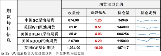 【1】WTI主力原油期貨收漲6.35美元,漲幅8.51%,報(bào)81.01美元/桶;布倫特主力原油期貨收漲4.01美元,漲幅4.93%,報(bào)85.41美元/桶;INE原油期貨收漲1.25%,報(bào)674元。
