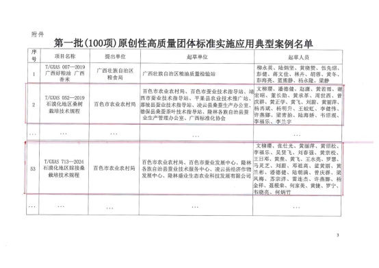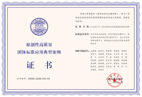 2026年初,廣西標(biāo)準(zhǔn)化協(xié)會公布第一批(100項)原創(chuàng)性高質(zhì)量團體標(biāo)準(zhǔn)實施應(yīng)用典型案例名單,由百色市農(nóng)業(yè)農(nóng)村局提出,百色市蠶業(yè)發(fā)展中心(原百色市蠶業(yè)技術(shù)指導(dǎo)站)牽頭,聯(lián)合市內(nèi)蠶桑技術(shù)服務(wù)部門及企業(yè)等共同制定的2項團體標(biāo)準(zhǔn)(T/GXAS 052-2019)《石漠化地區(qū)桑樹栽培技術(shù)規(guī)程》和(T/GXAS 713-2024)《石漠化地區(qū)嫁接桑栽培技術(shù)規(guī)程》成功入選,分列第2和53項。