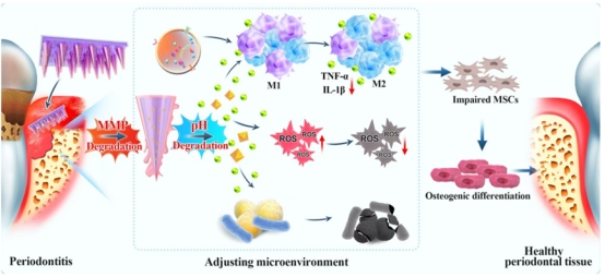 第一幕,外層快速反應(yīng)。貼片外殼可以識(shí)別到牙周炎局部微環(huán)境中相關(guān)信號(hào),比如過(guò)高的基質(zhì)金屬蛋白酶和較低的pH值,從而啟動(dòng)降解,釋放出其中包裹的納米藥物。這些藥物將像一支快速反應(yīng)部隊(duì),有效抑制促炎因子風(fēng)暴,控制炎癥。