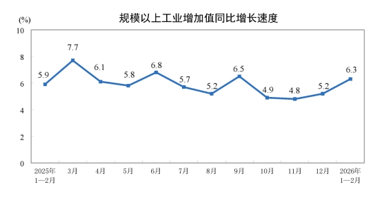 1—2月份,規(guī)模以上工業(yè)增加值同比實際增長6.3%(增加值增速均為扣除價格因素的實際增長率)。從環(huán)比看,2月份,規(guī)模以上工業(yè)增加值比上月增長0.83%。