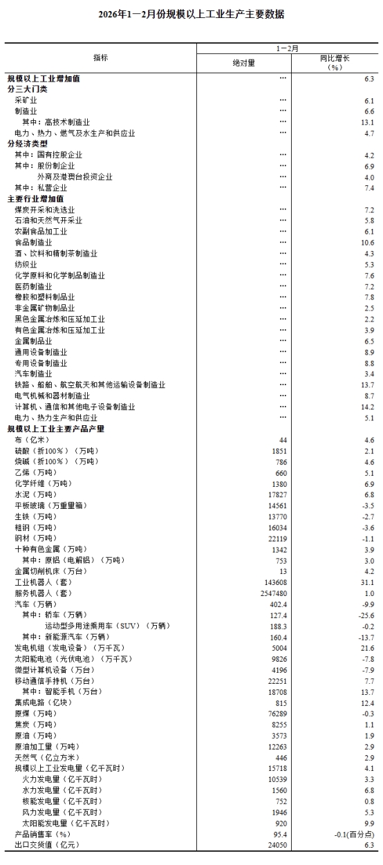分產(chǎn)品看,1—2月份,規(guī)模以上工業(yè)626種產(chǎn)品中有397種產(chǎn)品產(chǎn)量同比增長。其中,鋼材22119萬噸,同比下降1.1%;水泥17827萬噸,增長6.8%;十種有色金屬1342萬噸,增長3.9%;乙烯660萬噸,增長5.1%;汽車402.4萬輛,下降9.9%,其中新能源汽車160.4萬輛,下降13.7%;發(fā)電量15718億千瓦時,增長4.1%;原油加工量12263萬噸,增長2.9%。