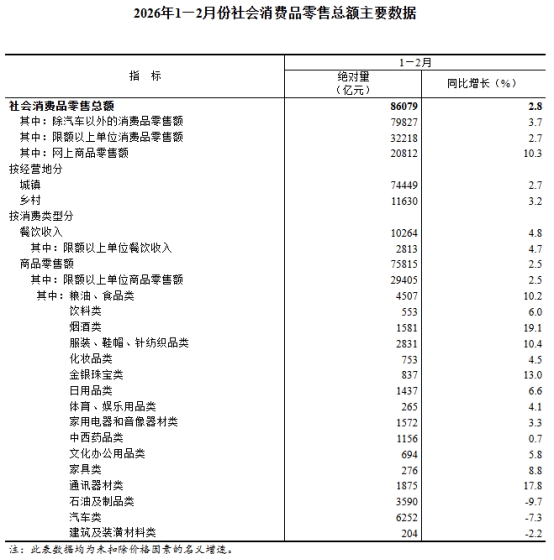1—2月份,社會消費品零售總額86079億元,同比增長2.8%。其中,除汽車以外的消費品零售額79827億元,增長3.7%。