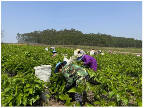3月13日,在石別沙坪小蠶共育基地周邊的桑園里,成片桑樹郁郁蔥蔥,鮮嫩桑葉掛滿枝頭,工人們正忙著采摘、分揀、裝運新鮮桑葉,一派豐收忙碌的景象?!艾F(xiàn)在我們在家?guī)屠习迥锸杖~子,一個月大概有4000塊錢的收入,然后也可以照顧小孩、照顧老人,我覺得非常好。”采摘桑葉的工人韋媛林笑著說道。