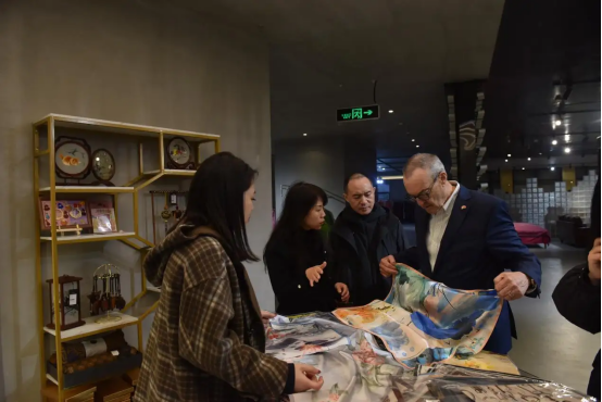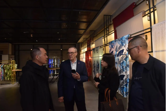 集團領導于六合絲綢產(chǎn)品體驗館向考察組介紹了六合集團的最新產(chǎn)品及其設計理念。隨后,一行人前往六合院、設備陳列館、生產(chǎn)車間等地點,深入了解六合集團的歷史脈絡與文化底蘊??疾炱陂g,羅伯特·谷伯樂對六合的絲綢產(chǎn)品表現(xiàn)出了濃厚的興趣,并且對六合產(chǎn)品進軍國際市場充滿了期待。