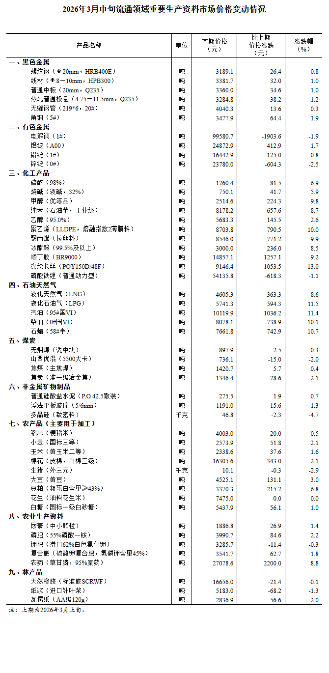 2026年3月中旬流通領(lǐng)域重要生產(chǎn)資料市場(chǎng)價(jià)格變動(dòng)情況