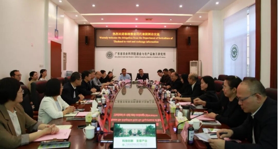 代表團(tuán)先后參觀了加工所科技成果展廳、中試平臺(tái)和?;~(yú)塘循環(huán)農(nóng)業(yè)示范基地等科研平臺(tái)。座談中,朱立學(xué)對(duì)泰方代表團(tuán)的到訪表示熱烈歡迎,并介紹了廣東農(nóng)科院與泰方在蠶??萍挤矫娴暮献髑闆r,提出了深化種質(zhì)資源與技術(shù)的互通共享、強(qiáng)化農(nóng)產(chǎn)品加工的協(xié)同創(chuàng)新與促進(jìn)人才交流與平臺(tái)共建等合作建議。泰方代表就泰國(guó)蠶桑產(chǎn)業(yè)現(xiàn)狀和存在的問(wèn)題進(jìn)行介紹,雙方圍繞中泰兩國(guó)未來(lái)蠶桑產(chǎn)業(yè)發(fā)展合作進(jìn)行了深入研討并達(dá)成了后續(xù)合作共識(shí)。