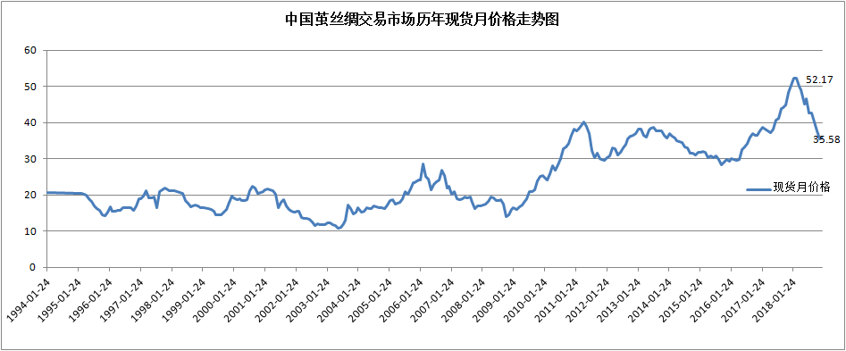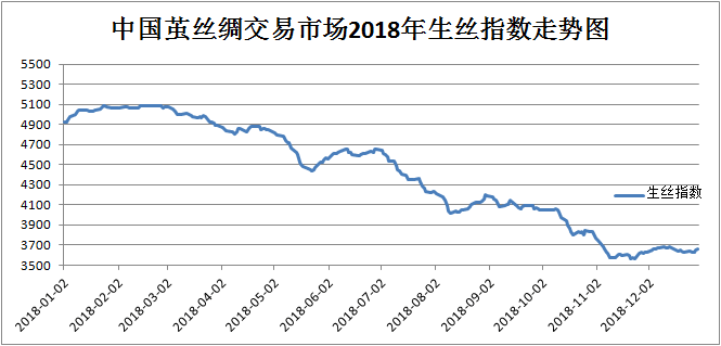 今日是2018年的最后一個交易日,主力合約以紅盤報收。2018年,生絲指數(shù)累計下跌25.6%?,F(xiàn)貨月價格從年初50.31萬下跌至36萬,累計下跌28.4%。但在連續(xù)收出陰線后,本月生絲指數(shù)難得劃出低位陽線。