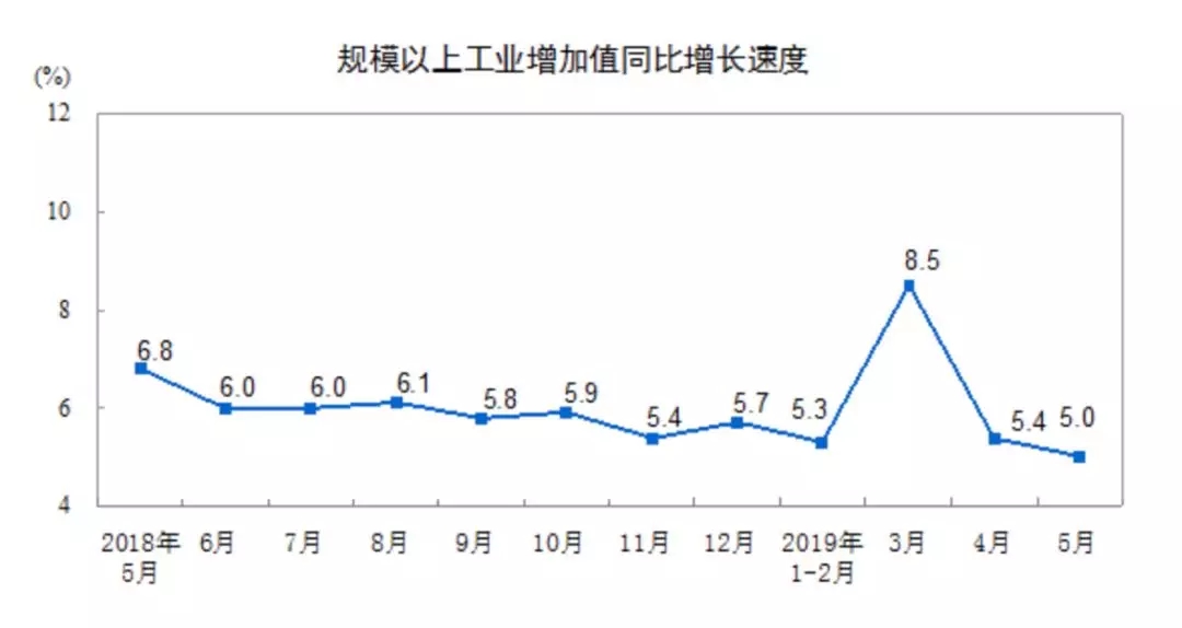 宏觀上,北京時(shí)間14日15點(diǎn),中國(guó)國(guó)家統(tǒng)計(jì)局公布了5月份經(jīng)濟(jì)數(shù)據(jù)。重要數(shù)據(jù)如下:工業(yè)增加值同比增5%,預(yù)期5.4%,前值5.4%;
