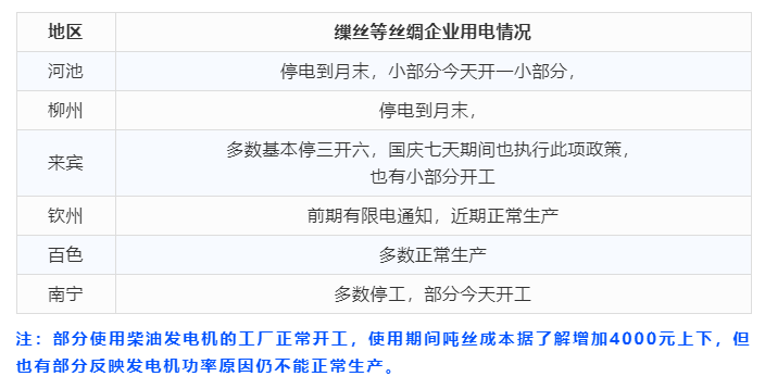 受“能耗雙控”持續(xù)加碼影響,被“點名”地區(qū)推出限電措施嚴控能耗強度。廣西限電措施升級,繅絲等企業(yè)昨日和今日紛紛收到限電通知。調查如下:對于十一期間及以后的生產安排,多數(shù)企業(yè)表示目前還沒有計劃,根據(jù)下月的用電措施再做安排。