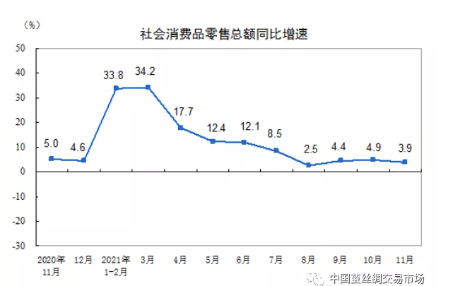 終端消費(fèi)數(shù)據(jù)上,11月份,社會(huì)消費(fèi)品零售總額41043億元,同比增長(zhǎng)3.9%;比2019年11月份增長(zhǎng)9.0%,兩年平均增速為4.4%。其中,除汽車以外的消費(fèi)品零售額37266億元,增長(zhǎng)5.4%??鄢齼r(jià)格因素,11月份社會(huì)消費(fèi)品零售總額同比實(shí)際增長(zhǎng)0.5%。從環(huán)比看,11月份社會(huì)消費(fèi)品零售總額增長(zhǎng)0.22%。 1—11月份,社會(huì)消費(fèi)品零售總額399554億元,同比增長(zhǎng)13.7%,比2019年1—11月份增長(zhǎng)8.2%。其中,除汽車以外的消費(fèi)品零售額360339億元,增長(zhǎng)14.0%。