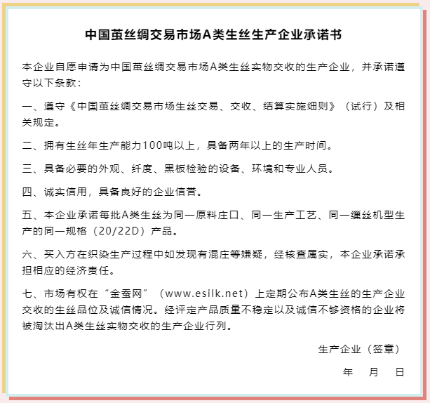 1.遵循現(xiàn)貨交易慣例,A類生絲的交易數(shù)量以“批”為單位,每批約在0.6噸,交易質(zhì)量等級(jí)為4A到6A均可。對(duì)于A類生絲實(shí)物交收的生產(chǎn)企業(yè),市場(chǎng)實(shí)行承諾準(zhǔn)入和指定檢驗(yàn)制度,歡迎符合要求的會(huì)員企業(yè)積極申報(bào)。