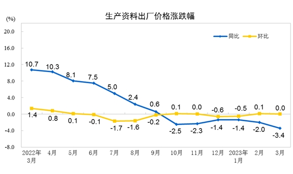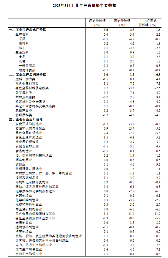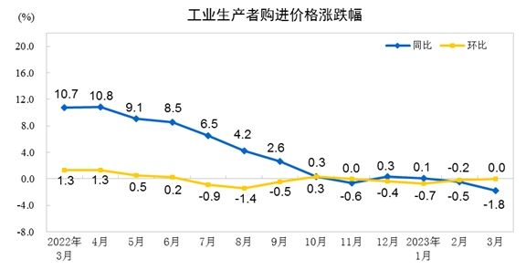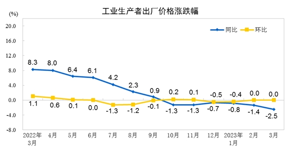 2023年3月份,全國(guó)工業(yè)生產(chǎn)者出廠價(jià)格同比下降2.5%,環(huán)比持平;工業(yè)生產(chǎn)者購(gòu)進(jìn)價(jià)格同比下降1.8%,環(huán)比持平。一季度,工業(yè)生產(chǎn)者出廠價(jià)格比去年同期下降1.6%,工業(yè)生產(chǎn)者購(gòu)進(jìn)價(jià)格下降0.8%。