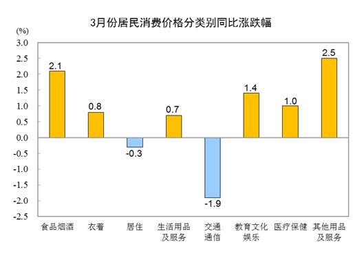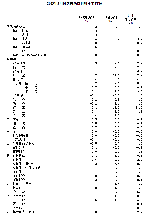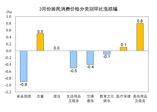 3月份,全國居民消費(fèi)價格環(huán)比下降0.3%。其中,城市下降0.3%,農(nóng)村下降0.3%;食品價格下降1.4%,非食品價格持平;消費(fèi)品價格下降0.5%,服務(wù)價格上漲0.1%。