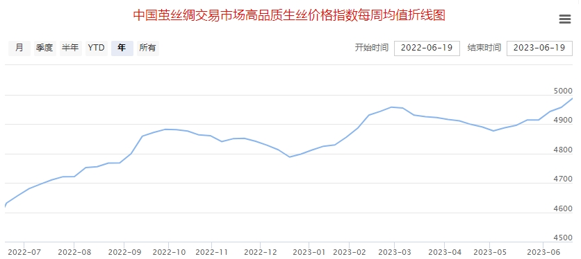 高品質(zhì)生絲指數(shù)上,本周正值端午小長(zhǎng)假,協(xié)作單位所報(bào)成交一般。高品質(zhì)生產(chǎn)協(xié)作單位內(nèi),品牌溢價(jià)本身就高的企業(yè)基本維持原價(jià),品牌溢價(jià)一般的企業(yè)成交價(jià)格整體有所上調(diào),也有部分企業(yè)仍舊維持原價(jià)和客戶(hù)進(jìn)行磨合。本周高品質(zhì)生絲指數(shù)上漲0.62%。
