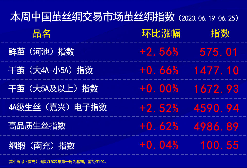 今日(2023年06月25日,周日)中國(guó)繭絲綢交易市場(chǎng)生絲指數(shù)微漲0.08%收于4590.94點(diǎn),本周生絲指數(shù)上漲2.52%。B絲(商檢4A級(jí)生絲):230625合約下跌0.09萬(wàn)元報(bào)收于45.48萬(wàn)元;230925合約下跌0.12萬(wàn)元報(bào)收于45.81萬(wàn)元;240325合約上漲0.03萬(wàn)元報(bào)收于46.86萬(wàn)元。