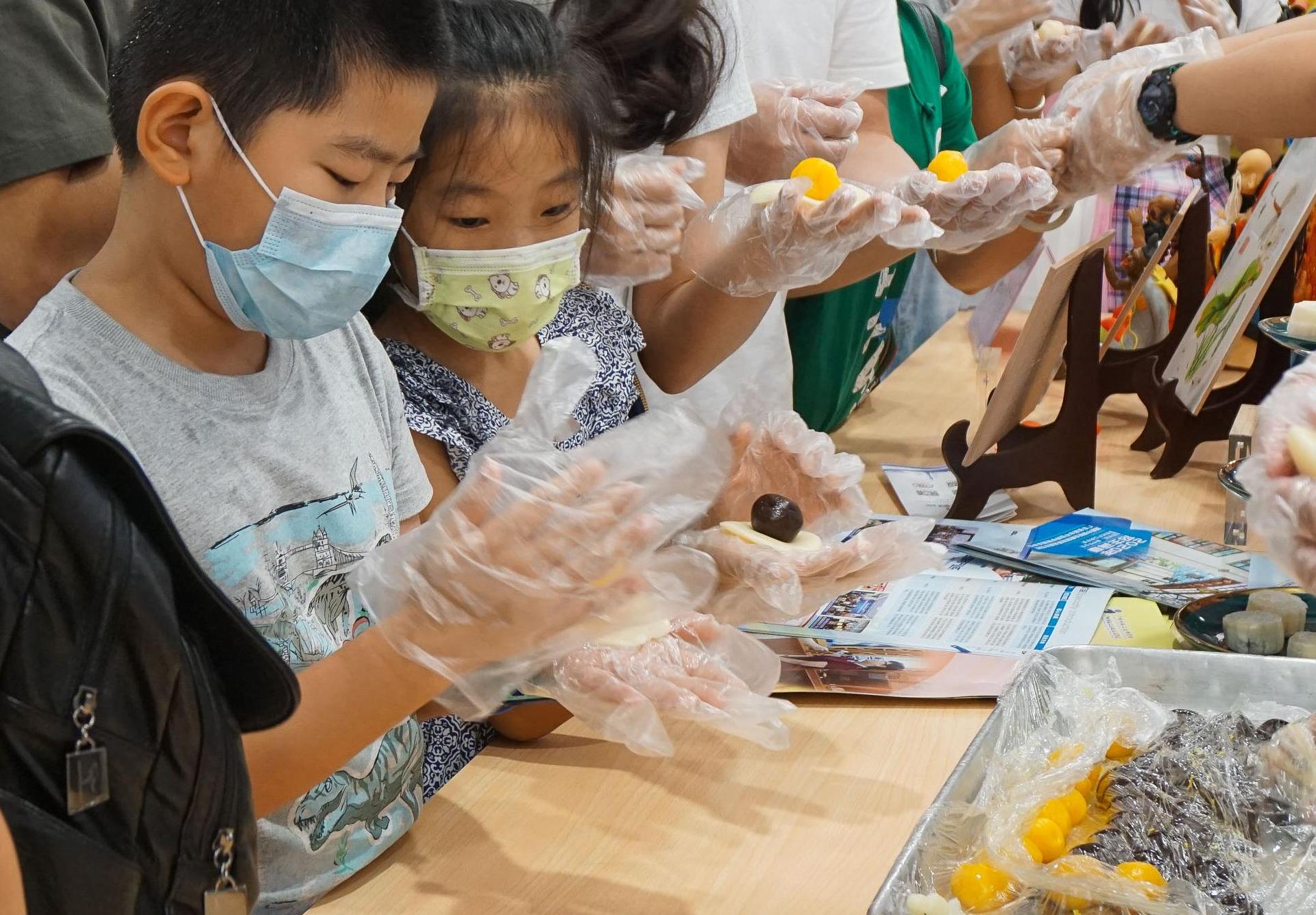Tourists try to make mooncakes at Beijing Road pedestrian street in Guangzhou, south China's Guangdong Province, Oct. 1, 2020. (Xinhua/Liu Dawei)