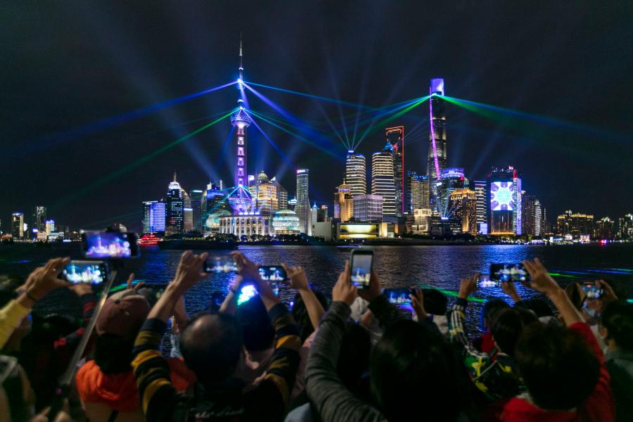 People enjoy a light show at the Bund in east China's Shanghai, Oct. 5, 2020. (Xinhua/Wang Xiang)