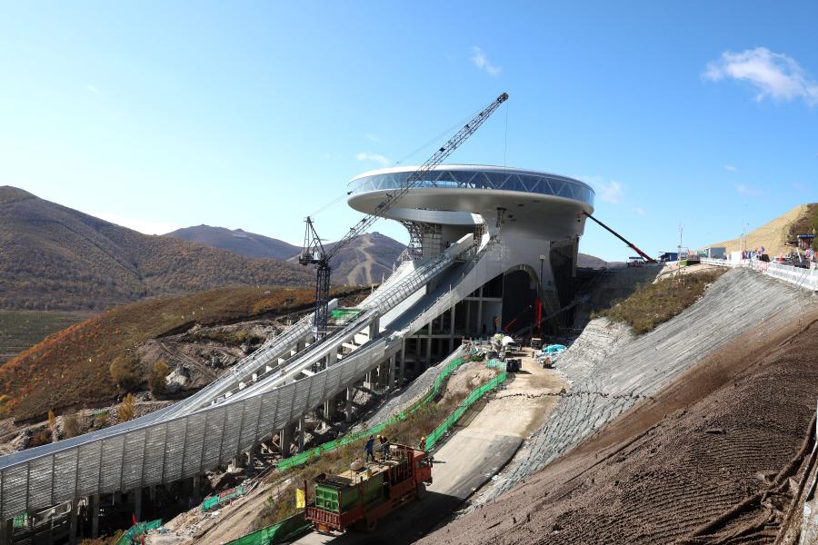 Construction workers are busy at the construction site of the National Ski Jumping Center in Chongli District of Zhangjiakou City, north China's Hebei Province, Oct. 2, 2020. (Photo by Wu Diansen/Xinhua)
