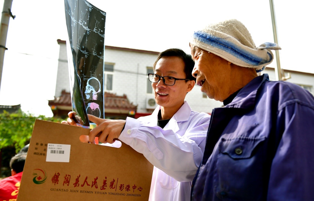 A medical worker explains the state of illness for a patient from Nansundiandong village at a hospital in Guantao