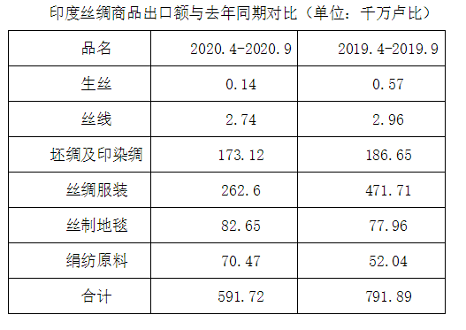 今年4月至9月期間,印度絲綢產(chǎn)品出口額為0.7916億美元(折合591.72千萬(wàn)盧比),與去年同期1.1119億美元(折合791.89千萬(wàn)盧比)相比,下降了28%。