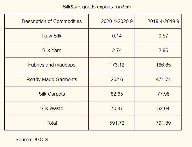 Moreover, it’s not just the silk goods exports that have been impacted. Even the imports of raw silk, yarn and fabrics have taken a beating due to the Covid. Silk goods imports fell sharply to ?272 crore ($36.22 million) during H1 this fiscal from ?781 crore ($110.15 million) in the same period last year, on account of sharp decline in import of raw silk and yarn. H1 raw silk imports were valued at ?203.92 crore ($27.17 million) as compared to ?588.45 crore ($82.92 million) in the same period last year.