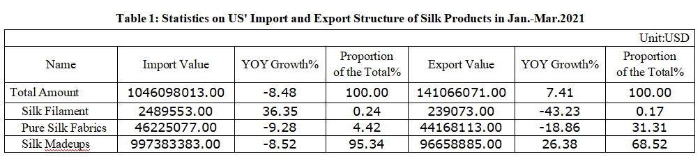 Table 1: Statistics on US' Import and Export Structure of Silk Products in Jan.-Mar. 2021